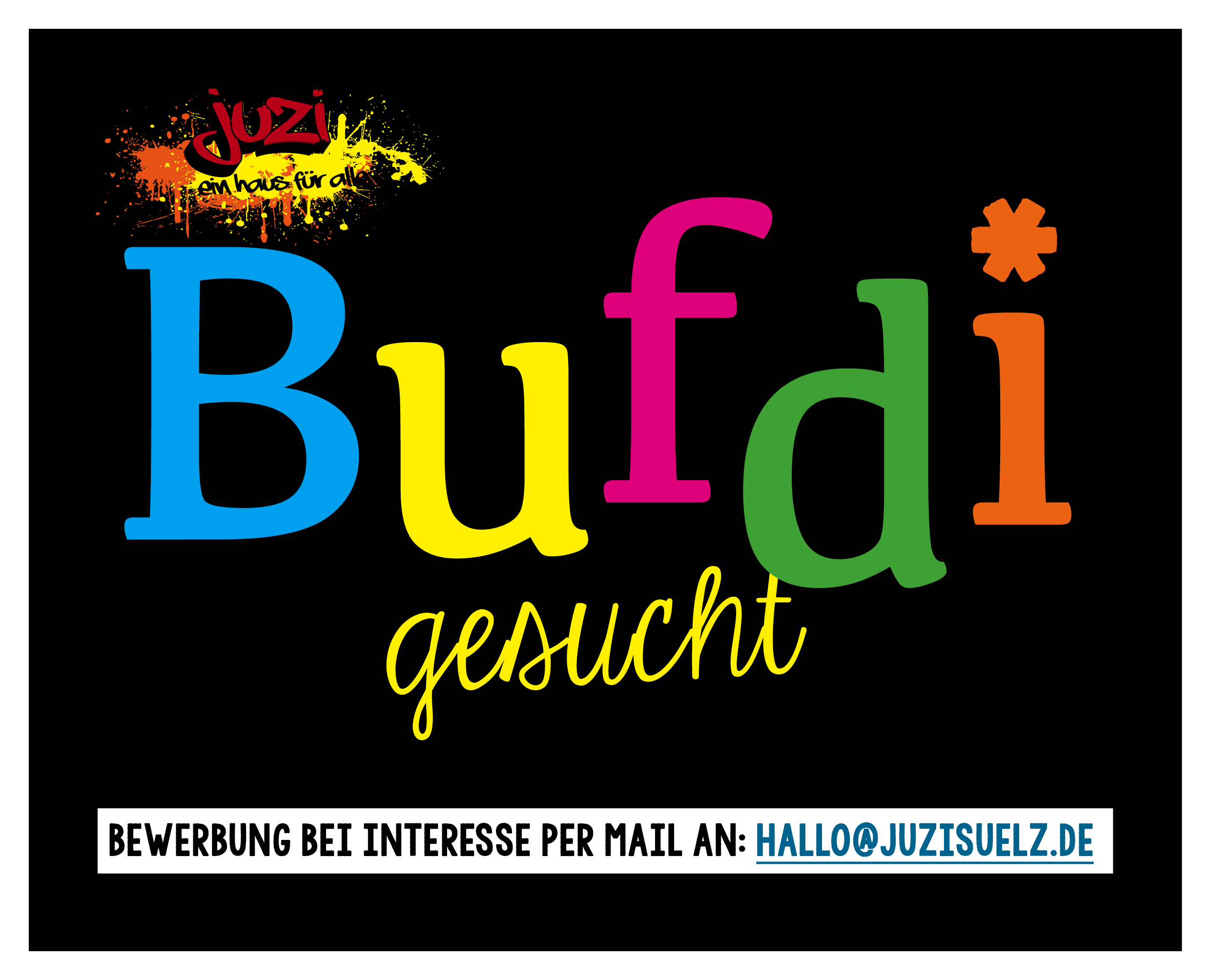 Du bist bereits volljährig, hast organisatorisches Geschick, bist verantwortungsbewusst im Umgang mit Kindern, Jugendlichen, Kollege*innen sowie Besucher*innen und zeichnest dich durch deine eigenständige Arbeitsweise sowie deine Teamfähigkeit aus? Dann freuen wir uns auf deine Bewerbung, die du bitte per E-Mail an die folgende Adresse sendest: hallo@juzisuelz.de